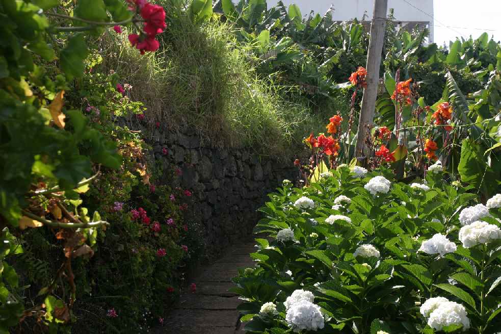 Overal bloemen en bananen, de levada is hier afgedekt als wandelpad