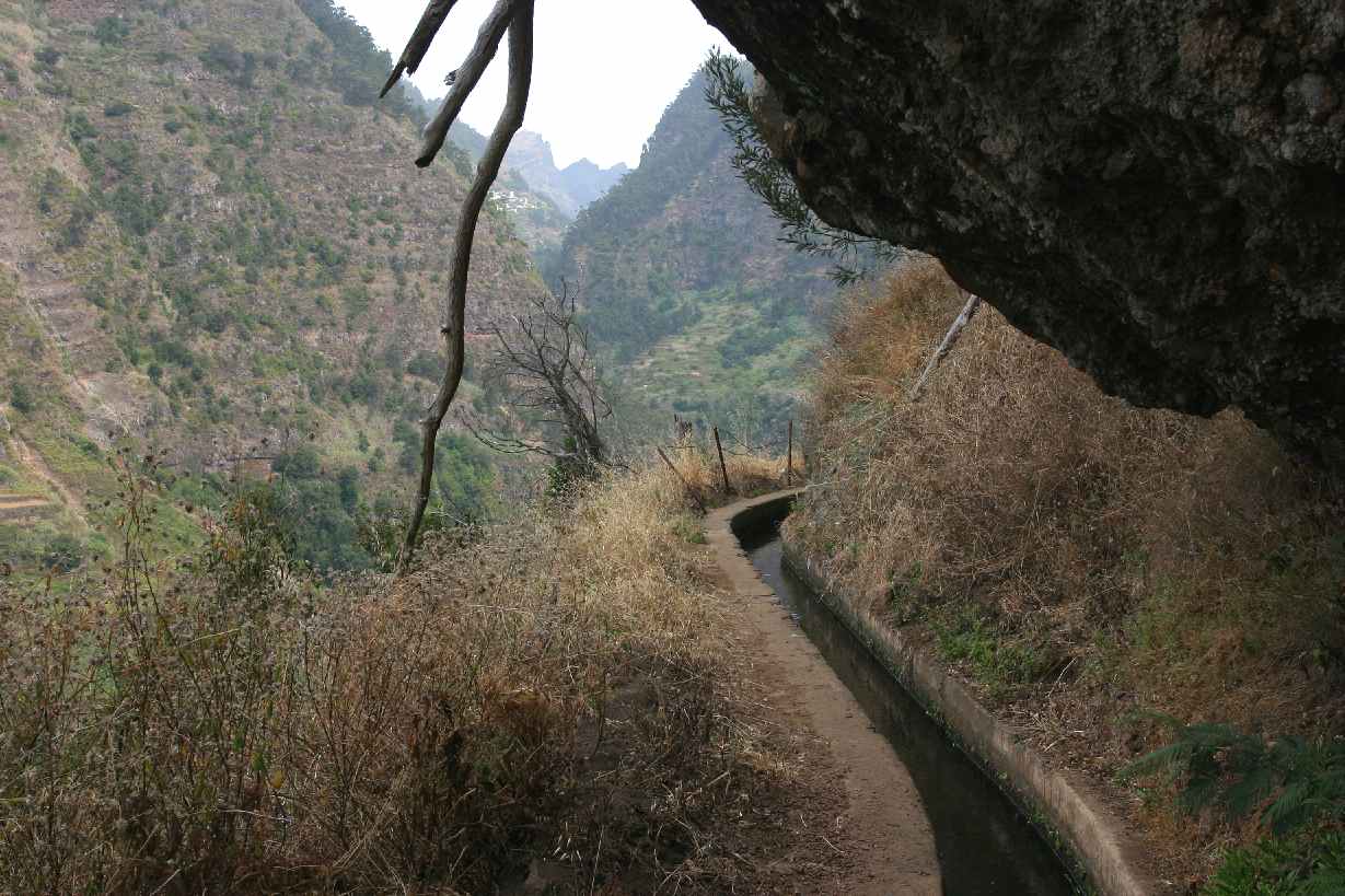 Met de bus naar een dal even buiten Funchal. Daar wandelen langs een paar levadas. Een levada is een kunstmatige waterloop die water uit de bergen naar de landbouwgronden brengt. Madeira heeft honderden kilometers levadas. Uit de bergen uitgehouwen volgen ze de hellingen. In de lager gelegen gebieden zijn er overal aftakkingen naar de terrassen met bananenbomen. Zo laat men op Madeira geen druppel water verloren gaan, alle bergstroompjes worden benut en zijn gekanaliseerd. Deze levadas vormen prima wandelroutes, op de rand van het muurtje kan je lopen, de hoogteverschillen zijn klein, de uitzichten spectaculair. Eerst door een gebied met veel tuinen, bananen en wijngaarden.